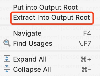 - 最重要的一步,在添加好.class文件之后,还没有把用到的相关依赖添加进去。这时候要选中界面右侧的项目,会出现很多依赖包。右键点击你需要的依赖,选择”Extract Into Output Root”.